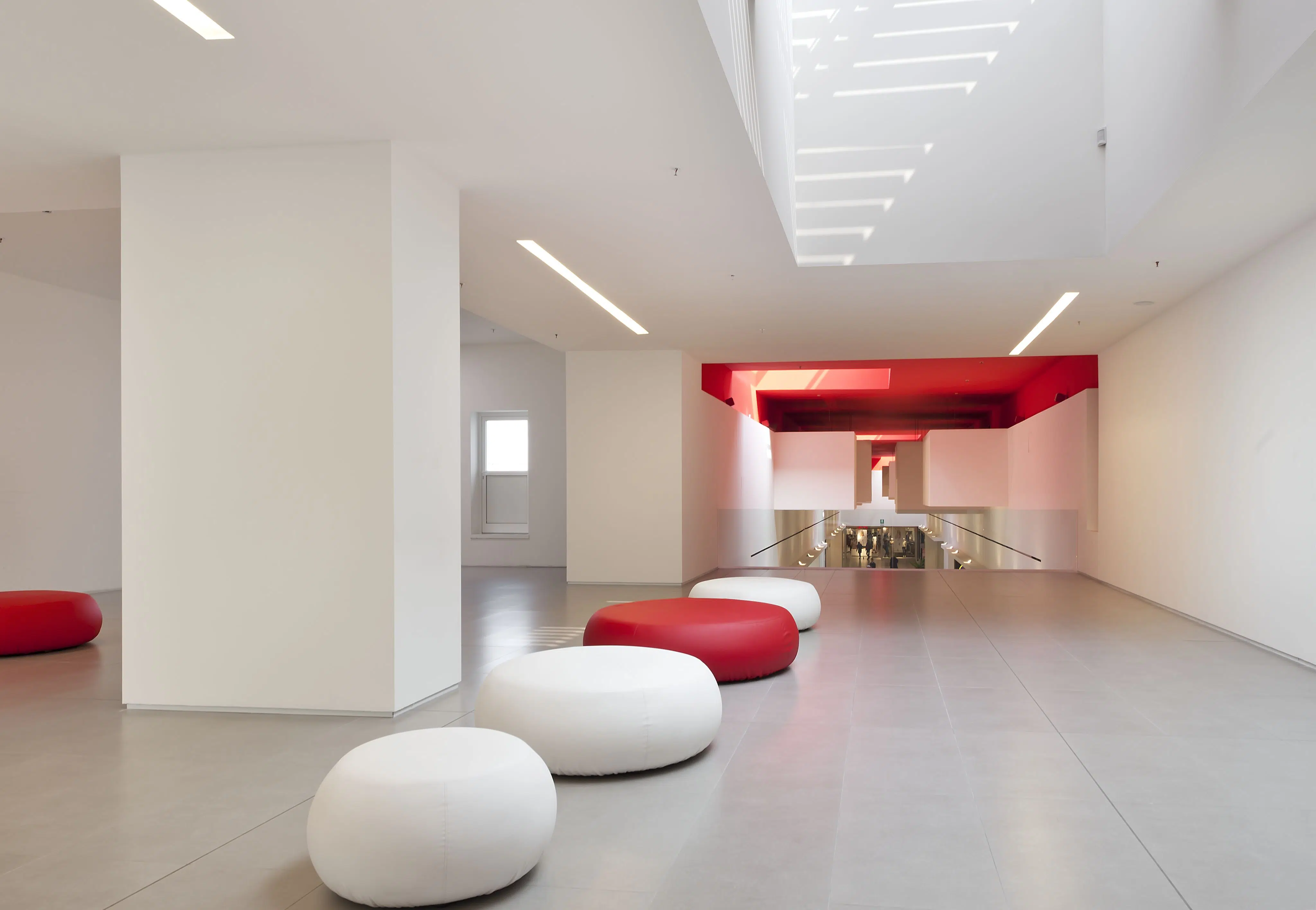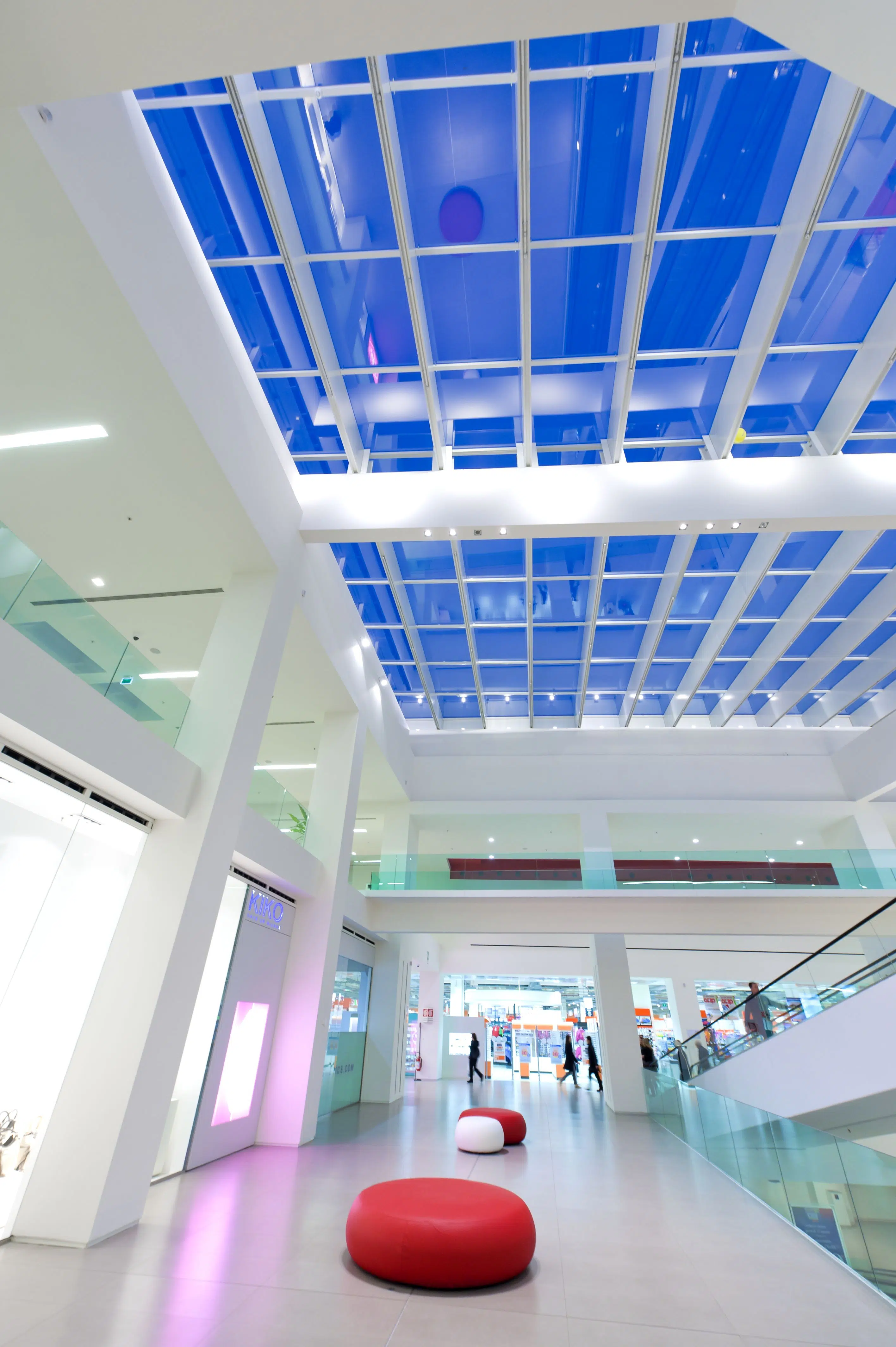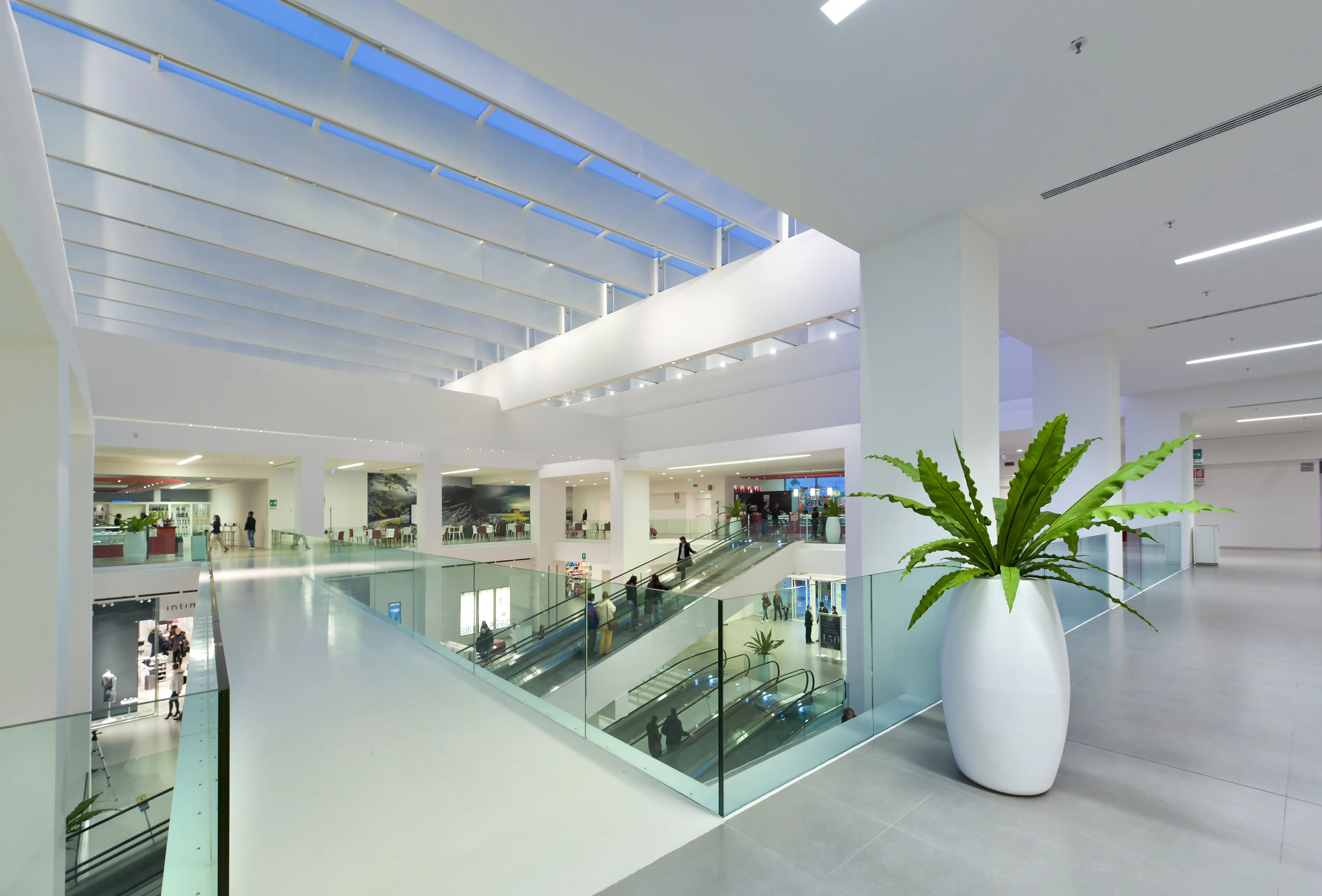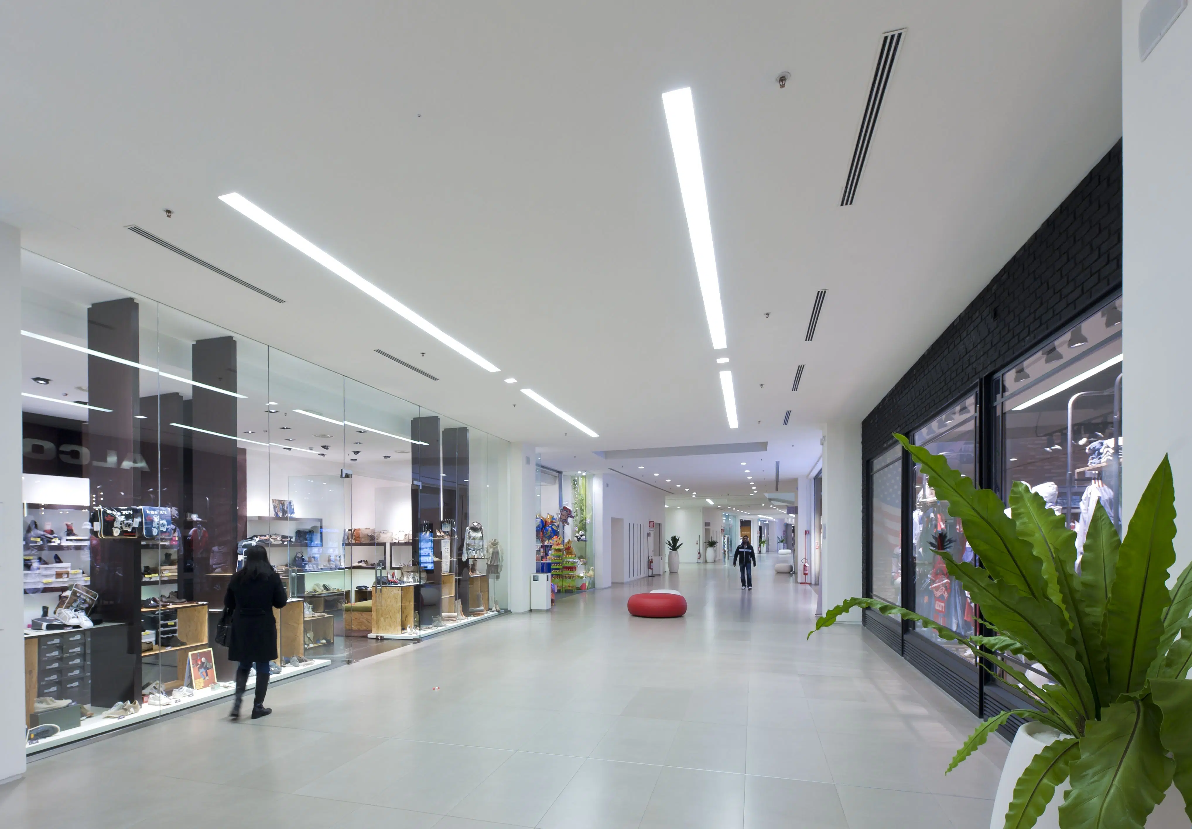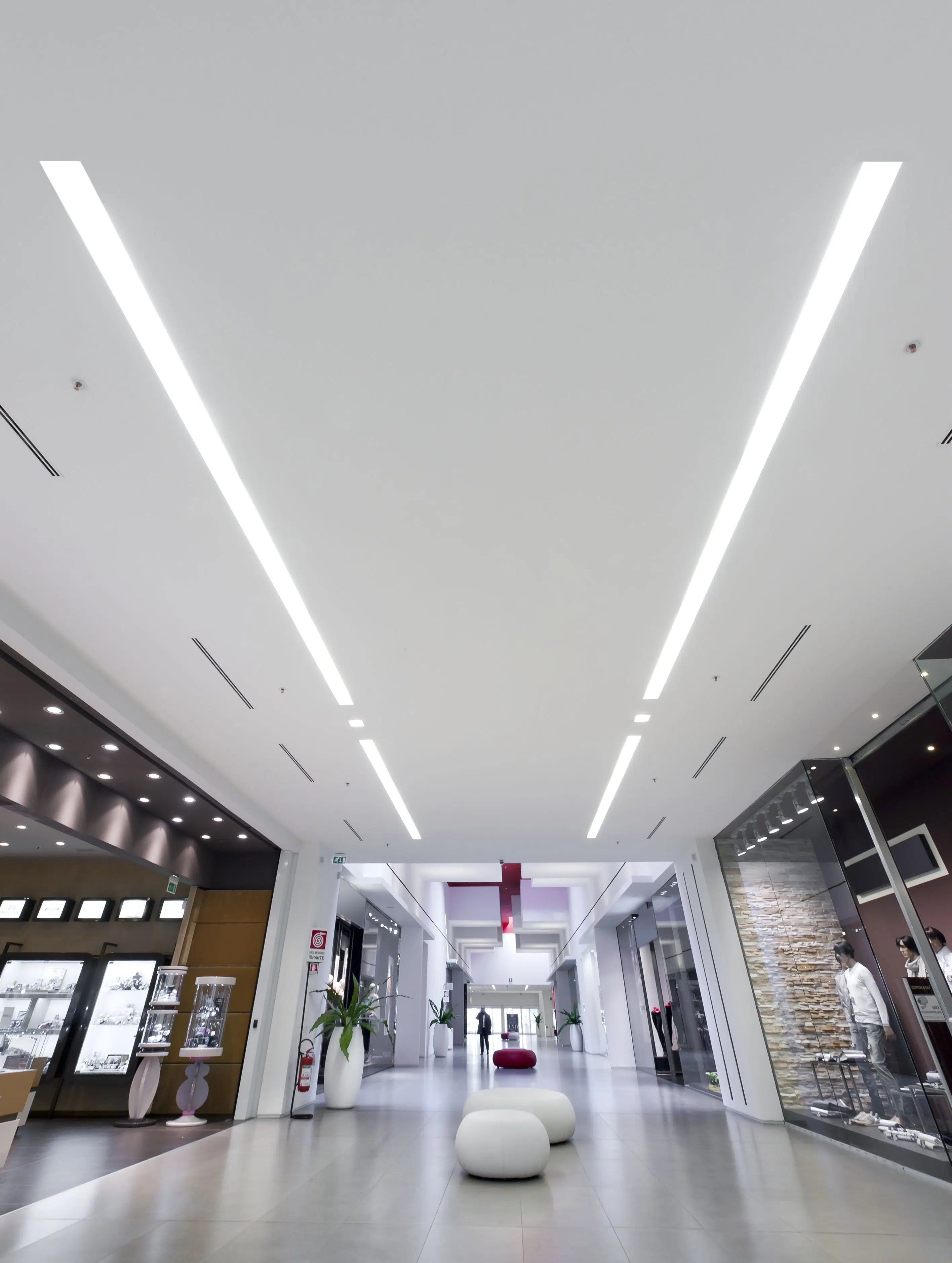 Conè, the new shopping centre located in the province of Treviso, opened on November 25th, 2010. It is 10,000 square meters and is home to a supermarket as well as 62 differentiated retail outlets. The photovoltaic system installed on the roof of the shopping centre provides most of the energy that is needed. To light the large gallery and all the common sections, the GUIDE recessed system was selected, in the dimmer fluorescent version, while for the accent lighting and common areas we used FILE, INCAS, INCAS V, NYX, and MINIFRAME, which perform their tasks with precision and minimalism. The products of the RIGO series were used for stairs and parking access, the latter also lit with Lucifero's INCAS fixtures.
